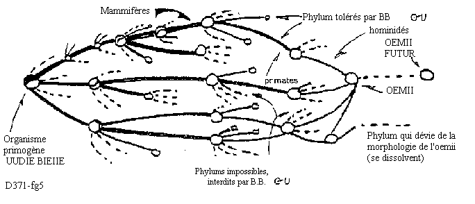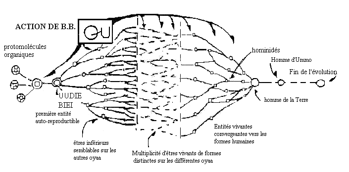 It is not the case: the various species, by evolution, must necessarily converge towards hominid structures. You can see it on the graph. If, on OYAGAA a branch of protomammals split into successive branches of mammals, if out of these one phyla was transformed into primates, if from these came the various hominids until Homo habilis and the higher branches, it is because mechanisms of selection and patterns of the B.B. accelerated the transformation of the genotype in this direction. Sooner or later the other animals would have ended up being transformed into beings very similar to Homo sapiens.