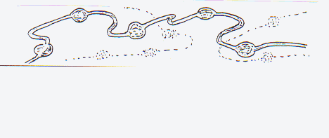 We say that an observer would perceive these large chains crossing in space without touching - except in rare circumstances - and would measure a temperature in their mass that enables them to emit quantons of energy (photons). (Note that in these chains, the matter, except in the filamentous sections, is not made of atoms but of strongly compressed particles without electric charge. There are no electronic shells nor orbitals whose electrons can emit energy quantified by changing level.) The thermal source of energy comes from the impacts of mass (+) with mass (-).