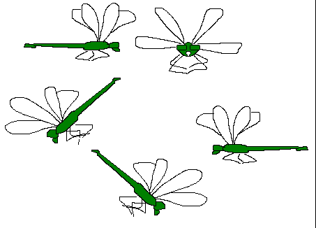 D59_FIG6All these dragonflies fly in such a way that not one has its wings oriented identically to any other. In other words, there will not be a single pair of dragonflies which, at a given moment, will be able to be superimposed so that the wings and the abdomens match exactly.. But, as we already said, this image is excessively simplified and distant in its analogy.